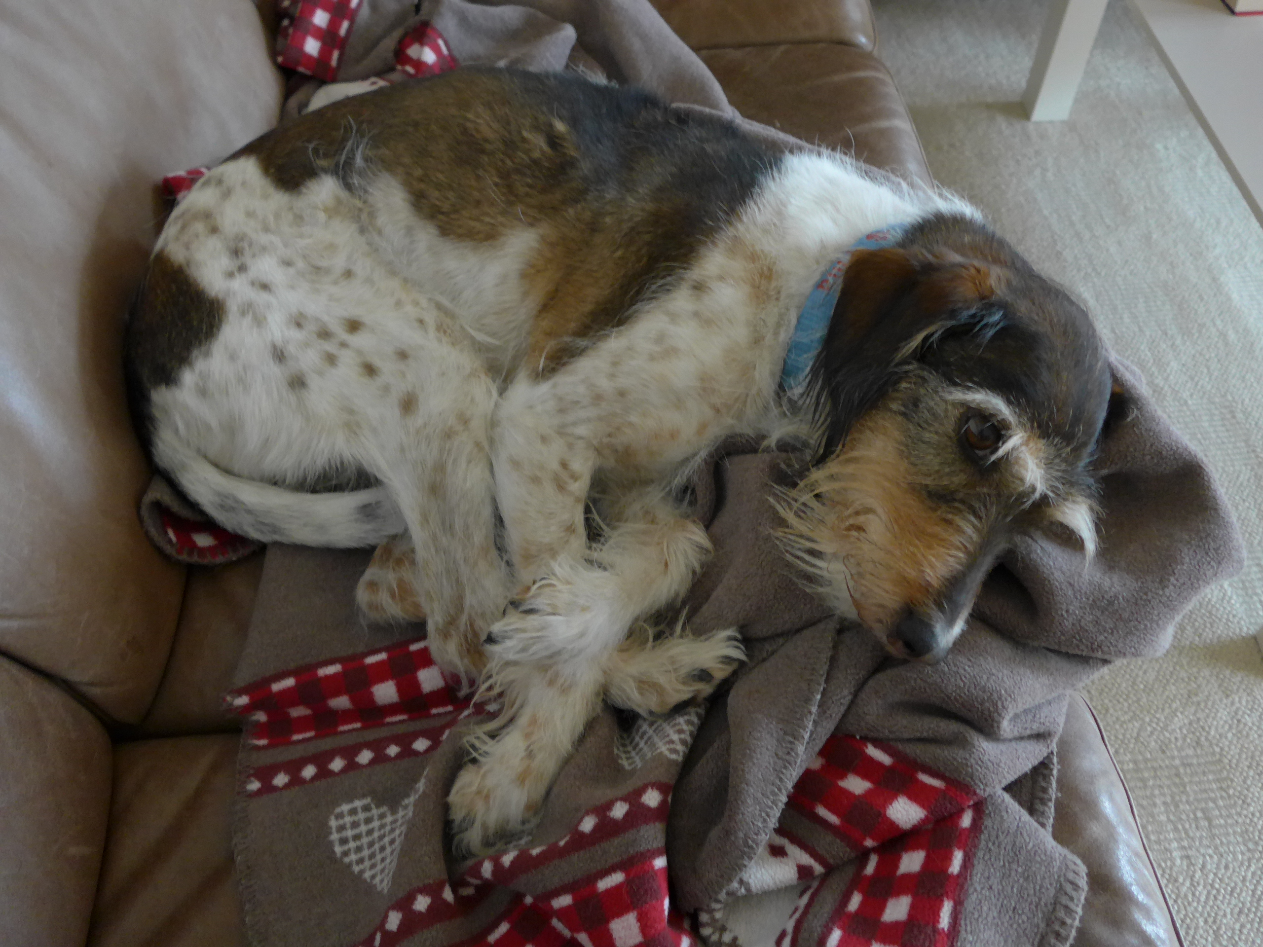 Mila bekam Antibiotikum und das Kortison sollte ausgeschlichen werden. Ausserdem sollte ich alle Salben weglassen. Es half: Die Wunde „siffte“ nicht mehr und die Wunde heilte zu.