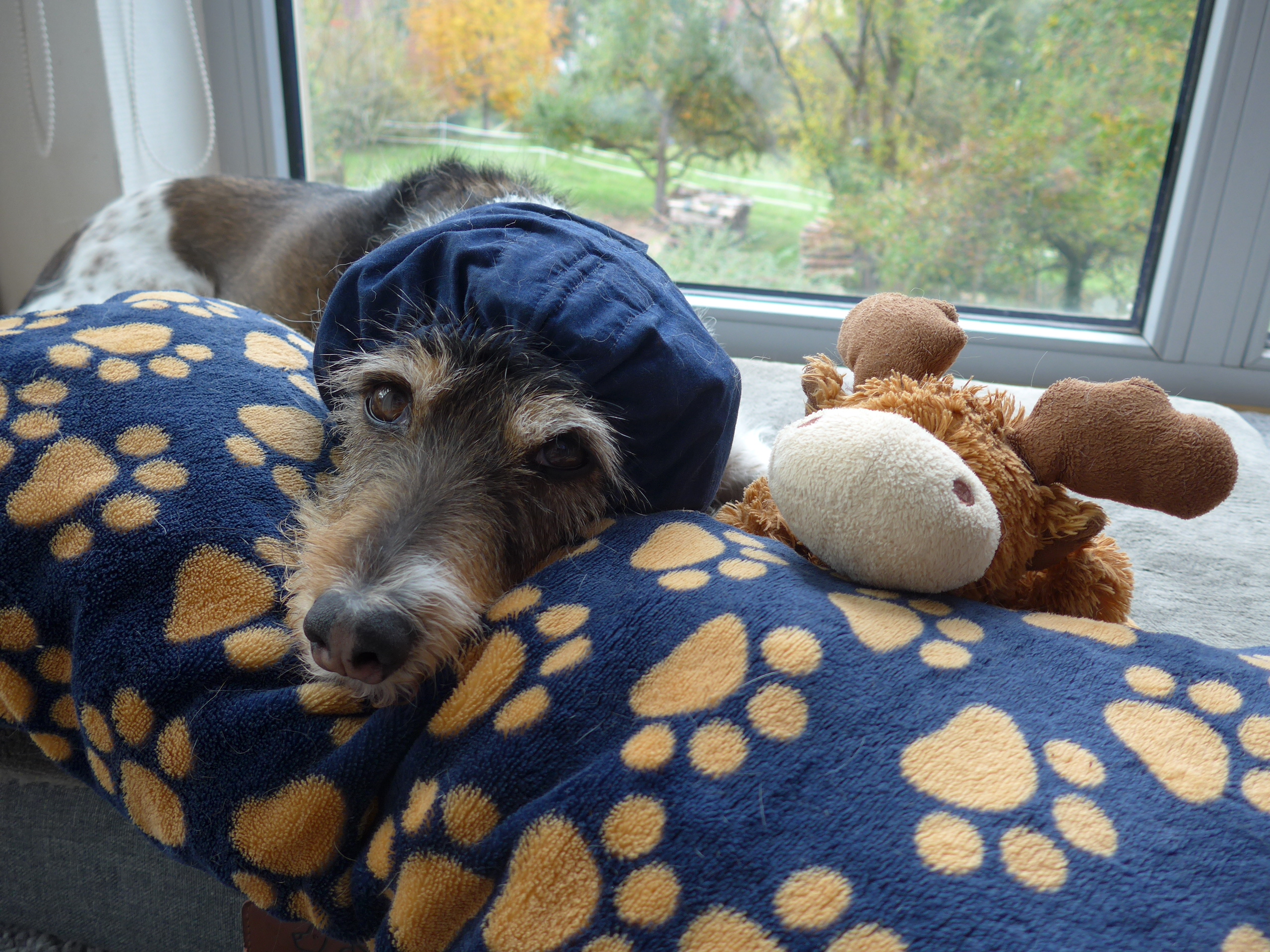 Derzeit braucht Mila die Mütze nicht. Die Ohren sind soweit stabil.