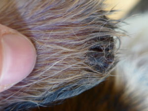 So sieht das Ohr im Moment aus. Alles trocken, es blutet nicht, Mila kratzt nicht daran.