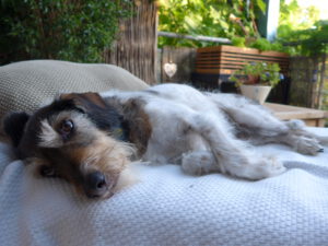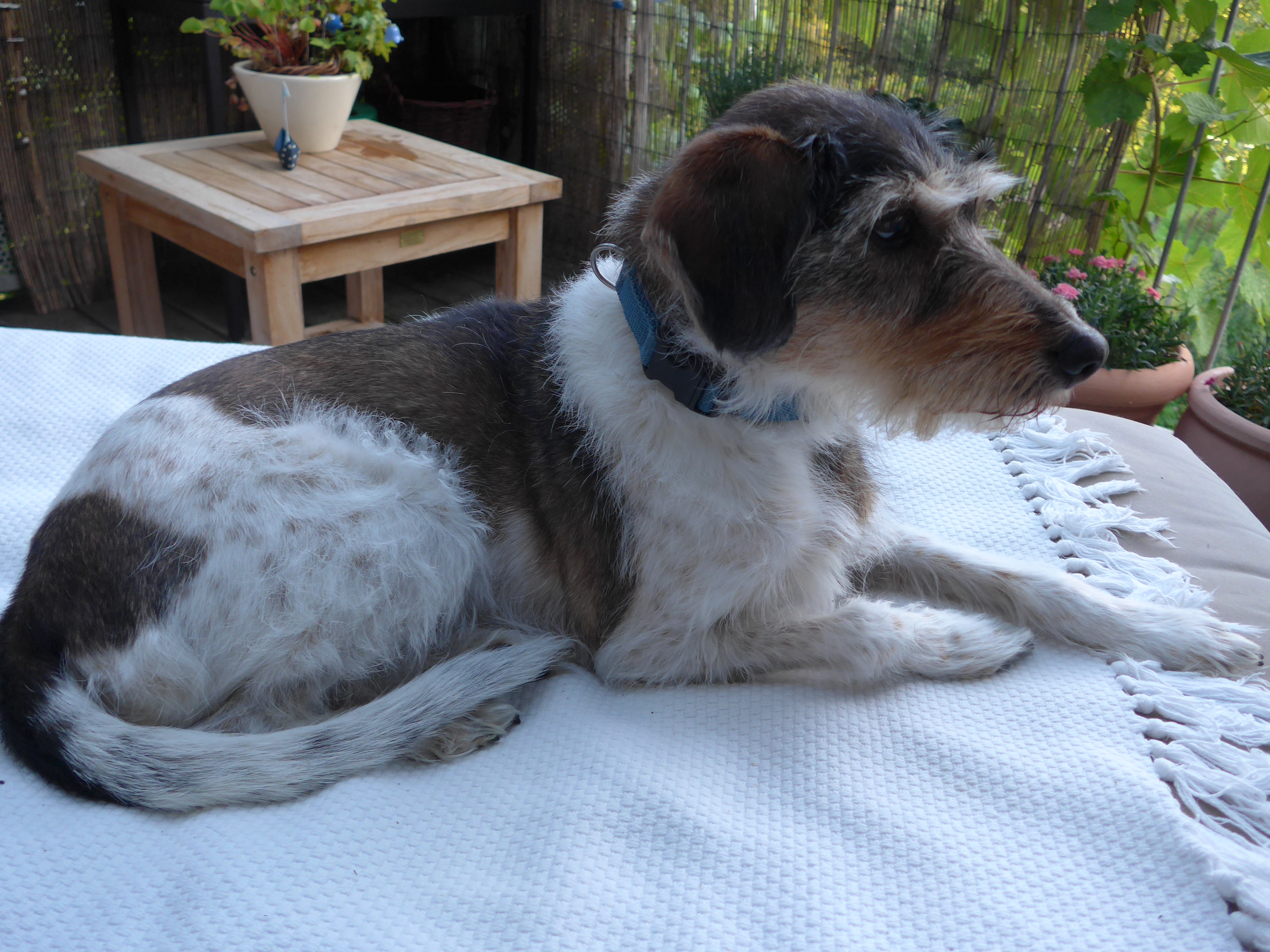Frustrierend: Gestern schrieb ich noch, dass Milas Ohren derzeit stabil sind. Und schon heute hat ein Ohrrand leider wieder geblutet. Mila zeigt keine Schmerzen an – aber man weiss ja, dass Kromfohrländer Weltmeister darin sind, Schmerzen zu kaschieren. Ich habe den Ohrrand mit Cortison besprüht, dann hat es schnell aufgehört zu bluten und es sah dann auch nicht mehr so schlimm aus wie hier auf dem Foto.