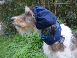 Über den Tierarzt habe ich eine medizinische Mütze bestellt. Mila findet es nicht gut, diese Mütze tragen zu müssen. Das muss sie aber auch nur dann, wenn ein Ohr wieder bluten sollte.